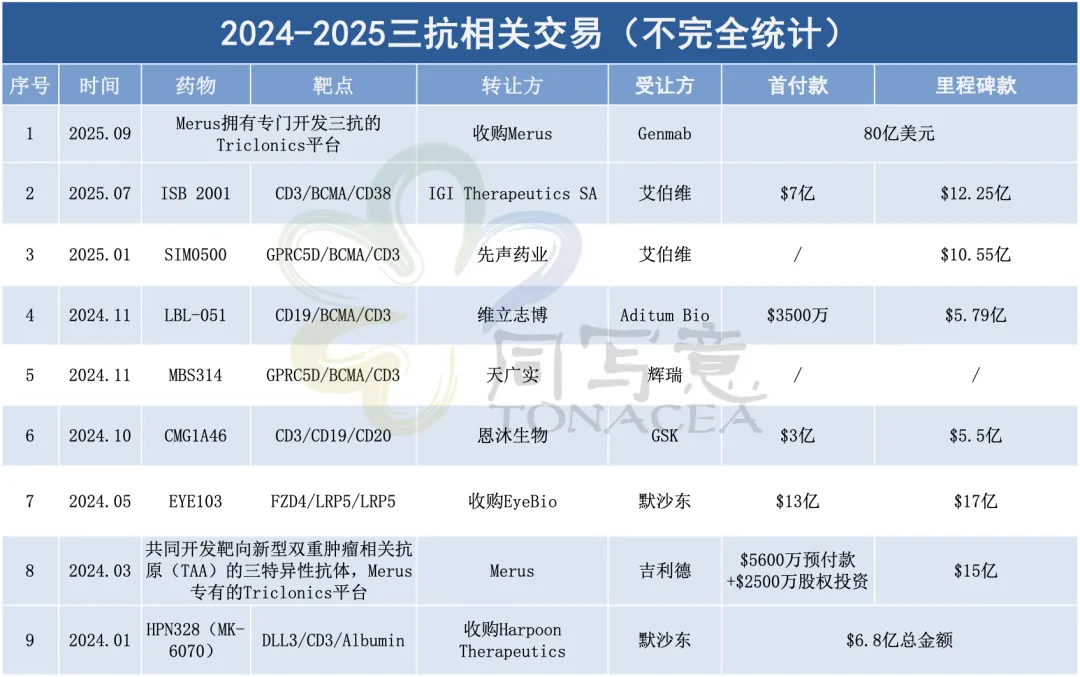 虽然目前未有三抗获批上市,但其潜力已引发国内外药企关注,并促使达成多项交易,不乏MNC的身影。