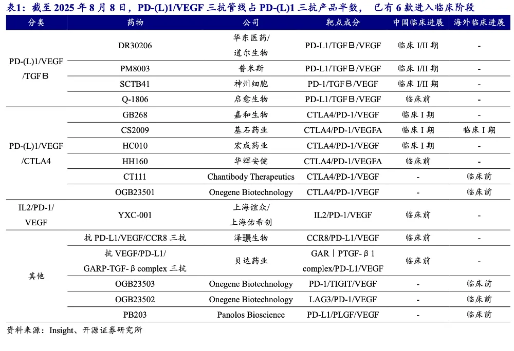 根据开源证券的统计,截至2025年8月8日,全球共有32款处于临床及临床前PD-(L)1三抗(项目状态积极),其中16款为PD-(L)1/VEGF三抗药物。