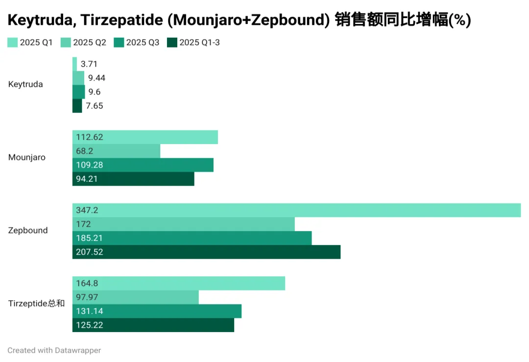 图2. Keytruda与Tirzepatide 2025年前三季度销售额同比增长对比。