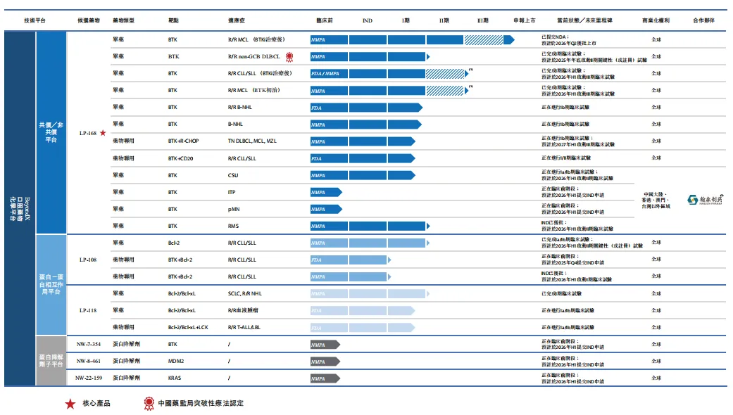 截至最后实际可行日期,麓鹏制药已建立包含六项主要候选产品的产品管线,其中三项为新药申请阶段及临床阶段的核心资产,即核心产品LP-168、LP-108与LP-118。