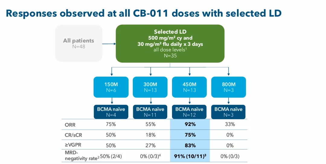 在1期试验CaMMouflage的剂量递增部分中,12名BCMA初治的r/r MM患者接受了450×10⁶ CAR-T细胞的推荐扩增剂量(RDE)的CB-011输注;接受RDE给药的患者中位随访时间为8.3个月,反应时间最长的患者在输注后15个月仍处于严格的完全缓解(sCR)。