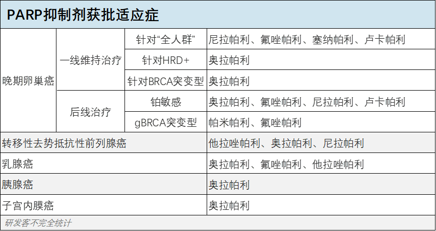当下,卵巢癌一线维持治疗是PARP抑制剂最大的市场,而截至发稿日在中国获批“全人群”(不论生物标志物状态如何)适应症的目前只有再鼎、恒瑞和英派3家,且考虑到研发和申报周期,短期内预计不会有新的竞争者。