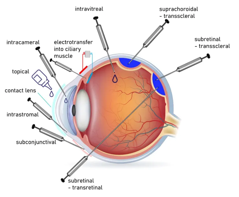 首先,眼部具有免疫豁免特权,血-视网膜屏障可减少全身免疫反应,降低治疗风险。其次,眼睛结构相对封闭且体积小,局部给药(如玻璃体内或视网膜下注射)可实现精准递送,所需药量少,副作用低。此外,许多致盲性眼病由单基因突变引起,靶点明确,为基因替代治疗提供了清晰的方向。