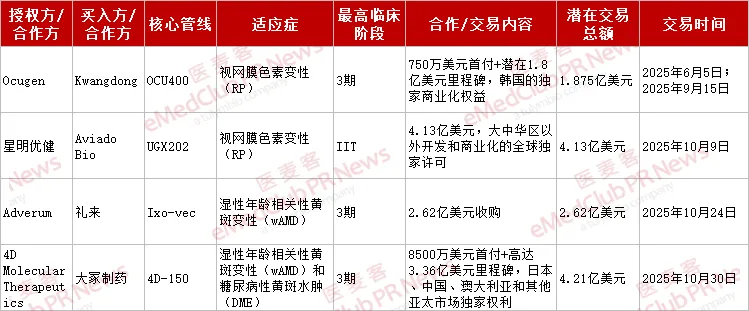 其他几项代表性交易同样展现出一定的商业化潜力。不管是礼来收购 Adverum、Ocugen 授权 Kwangdong 还是 4D Molecular Therapeutics 与大冢制药的合作,这些交易均聚焦于临床中后期管线,反映出行业对眼科基因疗法后期临床价值的认可与期待。