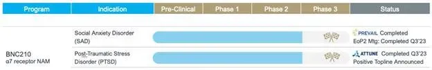 公司本身主要开发一款烟碱分子BNC210,靶向乙酰胆碱受体特定亚群,用于减轻压力和抗抑郁,适应症开发为交焦虑障碍(SAD,俗称社恐)和创伤后应激障碍(PTSD)