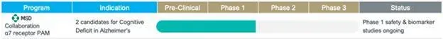 公司表示,MSD拿到的是一款原始先导分子BNC375,一种I型α7 nAChR PAM,后续又在其基础上开发了另外一款临床前小分子化合物MK-4334。目前正在阿尔茨海默病的二期研究中进行测试。