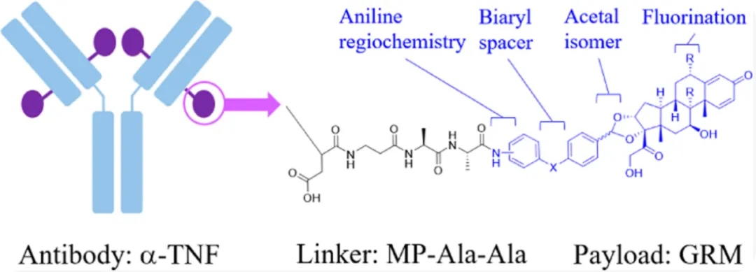 诞生过自免药王修美乐的MNC艾伯维成了这场时代竞争中的先行者,ABBV-773也是首个进入临床试验的抗炎ADC。该药物具体的制备和筛选过程可以参考ACS期刊上发表的文章《Discovery of ABBV-3373,an Anti-TNF Glucocorticoid Receptor Modulator Immunology Antibody Drug Conjugate》,文献让人不忍卒读,确实把筛选过程写的非常详细。