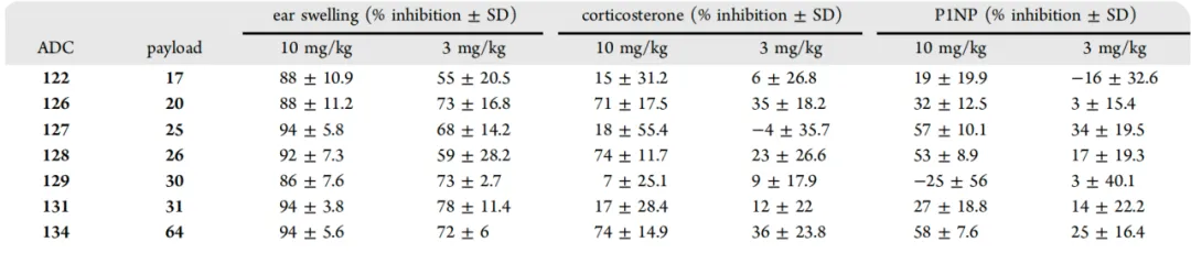 之后试验被推进至评估ADC候选分子在慢性炎症环境中的抗炎作用,于是多种ADCs推进至小鼠胶原诱导性关节炎(mCIA)模型中,该模型基本复刻了人类RA(类风湿关节炎)适应症的多种病理学特征。选了122,129和131还有126,其中前三种药物对炎症肿胀抑制性好而且对激素影响极小,但126就表现出了一定的对激素的抑制作用——对P1NP的影响程度中等,但仍显著抑制皮质酮。