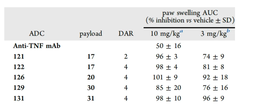 在mCIA模型中,单次给药后所有四种ADC的足部肿胀减轻效果均持续超过30天。且所有ADCs的疗效均显著优于母体单克隆抗体(阿达木单抗)。