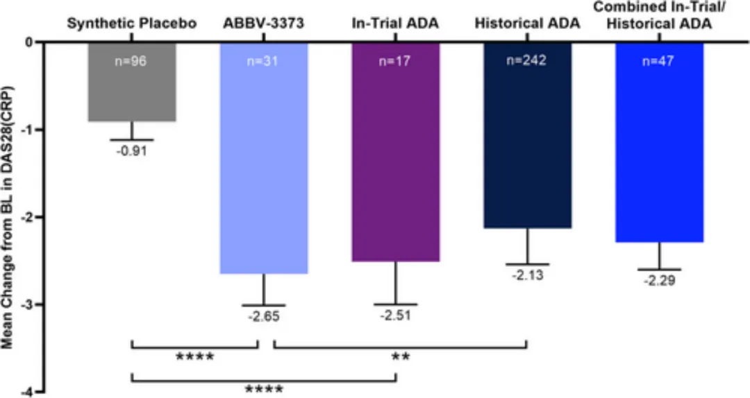 如图所示,虽然ABBV-3373(-2.65)显著优于安慰剂,并且显著优于历史上阿达木单抗的数据(-2.13),p=0.022。但是可以看到,该试验下,ABBV-3373和试验中阿达木单抗的数据差别不是很大。并且在次要终点上该药和阿达木单抗大部分指标也疗效相似。