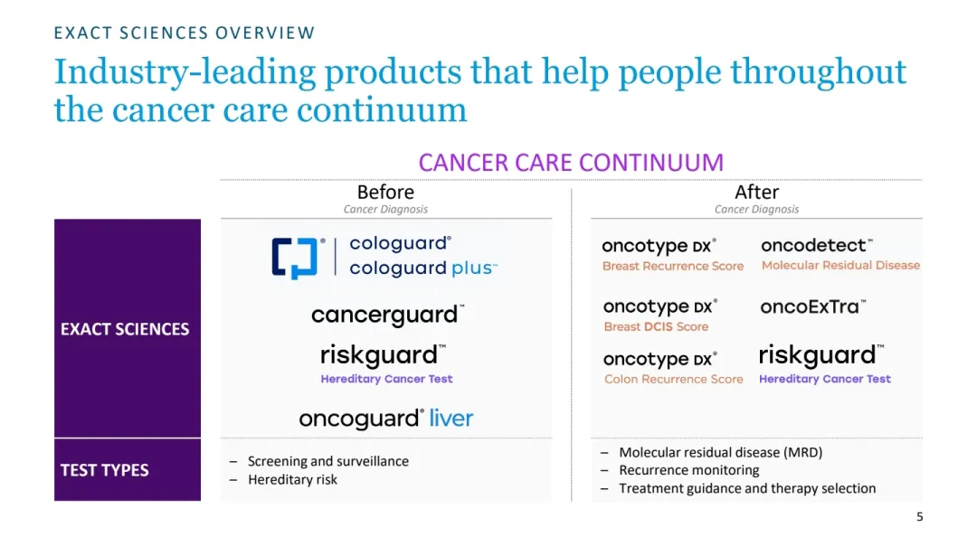 Exact Sciences 成立于 1995 年,专注于癌症早筛与精准诊断,拥有 7 000 余名员工,旗下产品覆盖结直肠癌、乳腺癌、肝癌、多癌种早筛及分子残留病灶(MRD)监测:
