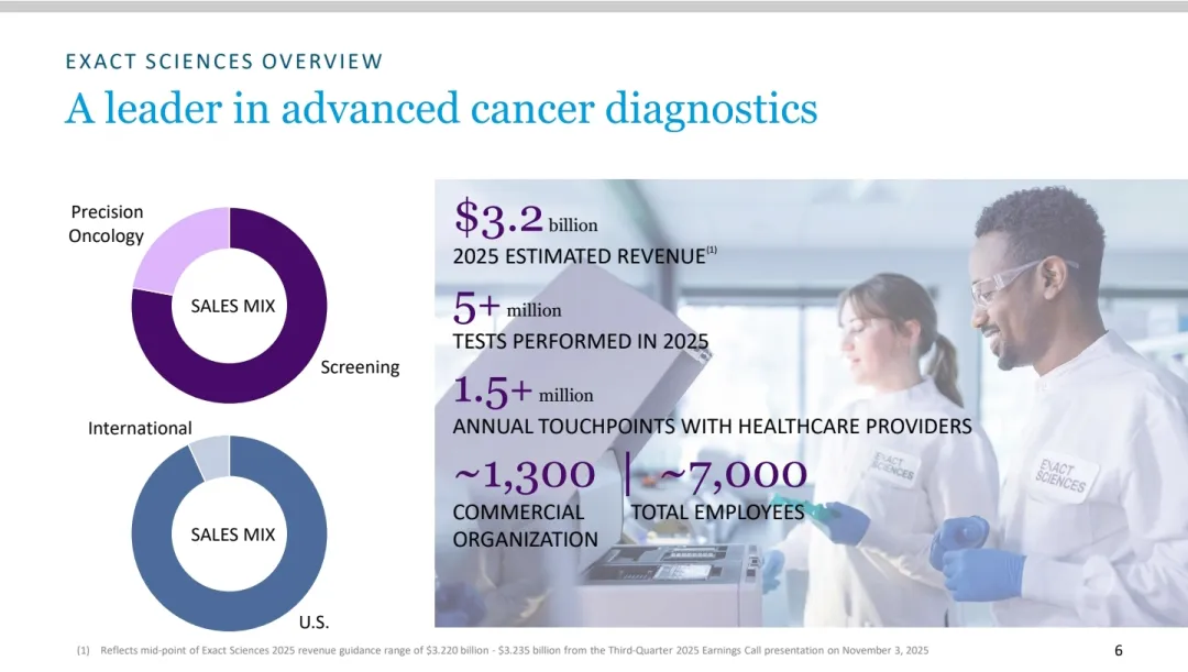 2025 年第三季度,Exact Sciences 实现营收 8.51 亿美元,同比增长 20%,全年预计32亿美元;其中筛查业务 6.66 亿美元,精准肿瘤业务 1.84 亿美元,净亏损收窄至 2 000 万美元。