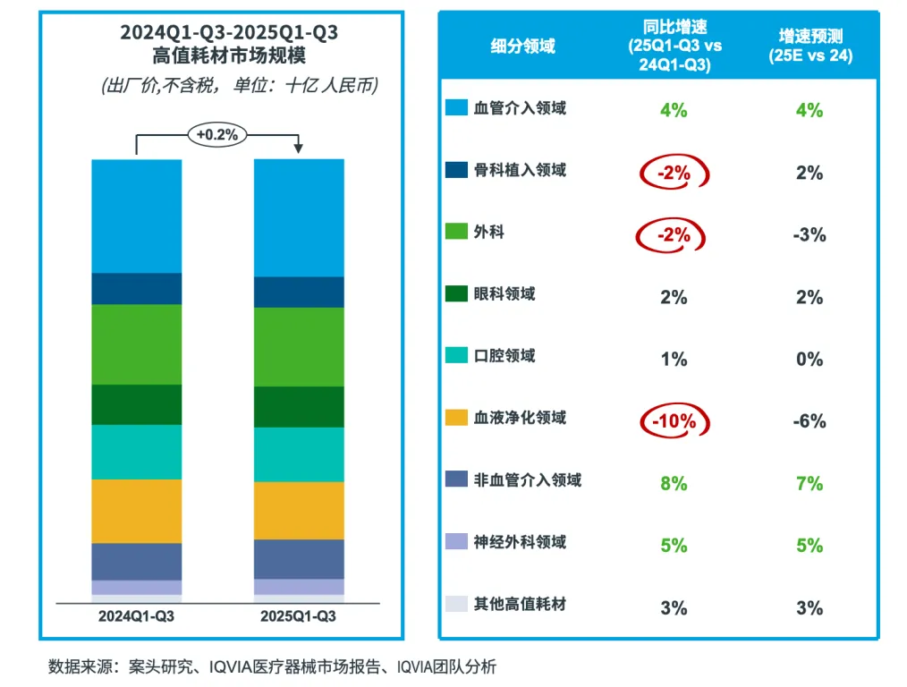 高值耗材市场在2025前三季度市场规模同比上升0.2%,其中增长较快的血管介入、非血管介入和神经外科领域在未来一年内预计均会受到带量采购不同程度的影响。