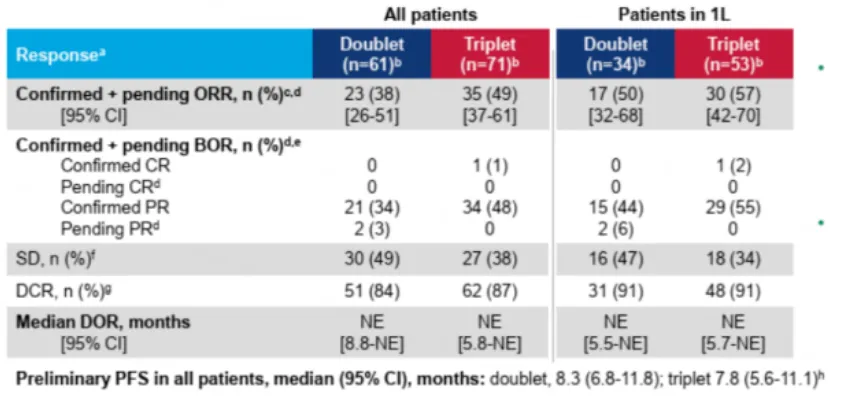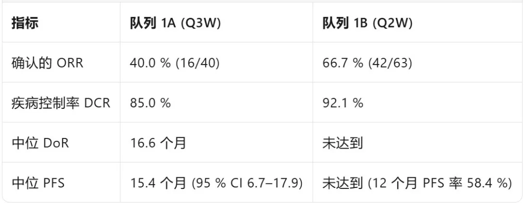 截至2024年5月27日,1A和1B队列中位随访时间分别19.3个月和13.0 个月,ORR分别为40%、66.7%,DCR分别为85%、92.1%,mPFS为15.4个月和未达到 (12个月PFS率58.4%)。