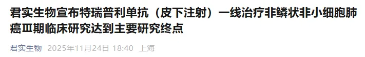 11 月 24 日,君实生物宣布,其自主研发的特瑞普利单抗注射液(皮下注射)(产品代号:JS001sc)对比特瑞普利单抗注射液(产品代号:JS001)联合化疗一线治疗复发或转移性非鳞状非小细胞肺癌(NSCLC)的多中心、开放、随机对照 III 期临床研究(JS001sc-002-III-NSCLC 研究)达到主要研究终点。