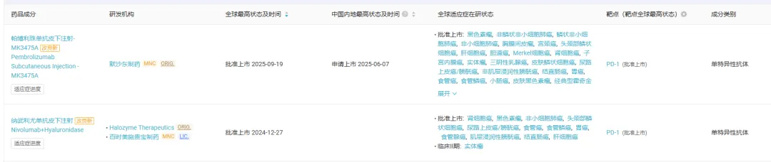Insight 数据库显示,目前全球范围内共有 10 款皮下注射的 PD-1 单抗在研,其中已有 2 款获批上市,分别为默沙东的帕博利珠单抗皮下注射-MK3475A(PD-1)、BMS 的纳武利尤单抗(PD-1)。