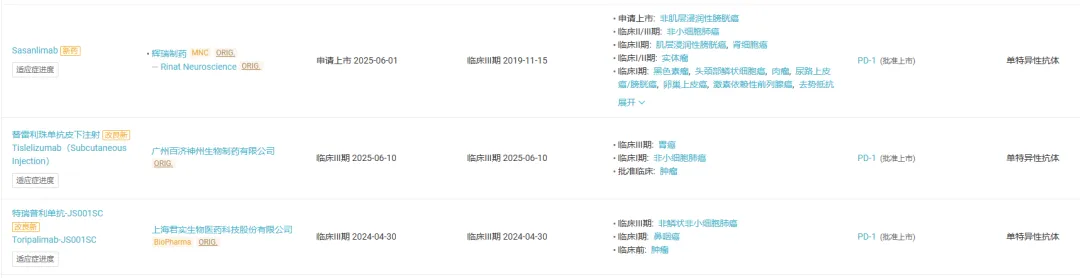 辉瑞的皮下注射 Sasanlimab(PD-1)处于上市审评阶段,百济神州的替雷利珠单抗皮下注射(PD-1)、君实生物的特瑞普利单抗-JS001SC(PD-1)进入 III 期阶段。