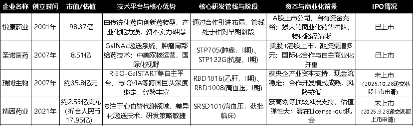 悦康药业凭借着从药品研发环节,到生产流程,再到销售终端的全产业链条优势,以及横跨多个治疗领域、涵盖多种剂型的完备产品体系,彰显出深厚的传统制药企业底蕴与坚实的产业化运作能力。目前,它已构建起小核酸药物、mRNA疫苗、多肽药物、中药创新药等多领域齐头并进、深度拓展的创新药研发架构。在四家企业当中,悦康药业市值位居榜首,这充分体现出市场对其深厚实力积累以及转型发展潜力的高度肯定与积极预期。
