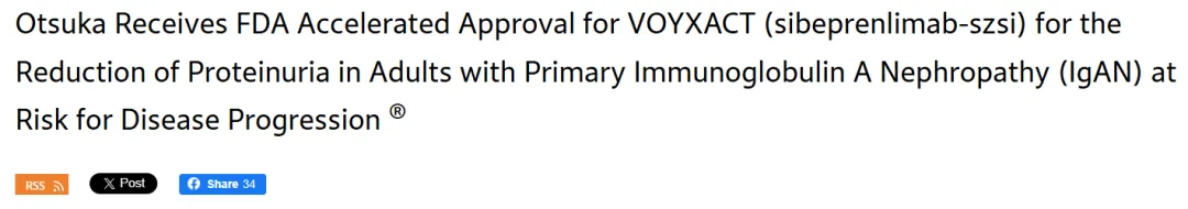 2025年11月26日,大冢制药宣布旗下斯贝利单抗(Sibeprenlimab,商品名:Voyxact)获FDA加速批准上市,用于治疗有疾病进展风险的原发性免疫球蛋白A肾病(IgAN),以减少蛋白尿。