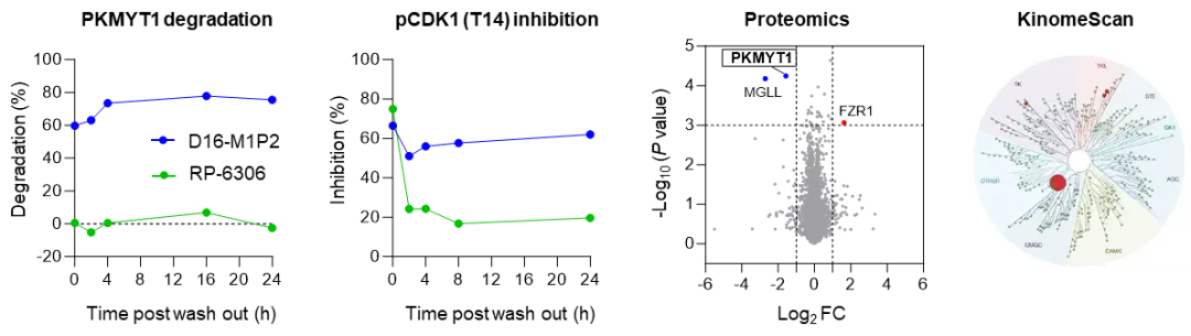 与传统的PKMYT1抑制剂相比,D16-M1P2能够通过泛素-蛋白酶体系统实现对PKMYT1的完全降解,从而诱导出更持久的细胞效力,在药物洗脱后,其活性可至少维持24小时。此外,D16-M1P2还具有双重作用机制:在低浓度条件下主要通过降解PKMYT1发挥作用,而在较高浓度时则还可抑制残余的激酶活性,从而实现对相关信号通路的全面抑制。
