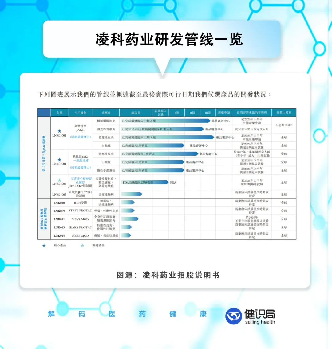 11月30日,凌科药业正式向港交所递交了招股说明书。这是一家从事自免小分子研发的企业,核心产品是第二代JAK抑制剂LNK01001,以及第三代软性泛JAK抑制剂LNK01004。