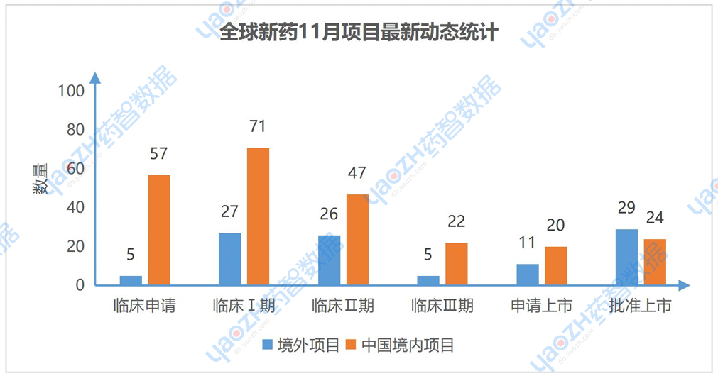 11月共831个药物有相关更新动态,其中有344个项目推进到最新的阶段,其中在中国境内进行的项目共241个,境外项目有103个。