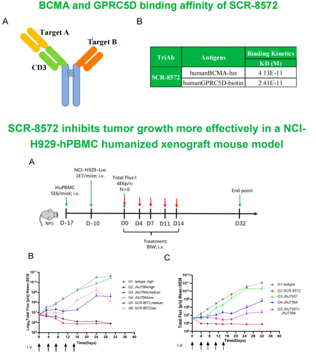 先声的SIM-0500结构如下图所示,三个靶点各一个臂。从Kd值来看,与GPRC5D的亲和力大约为BCMA的将近两倍。临床前试验来看,该药物似乎要优于强生两款双抗的联用(图C:G5和G2对比)。