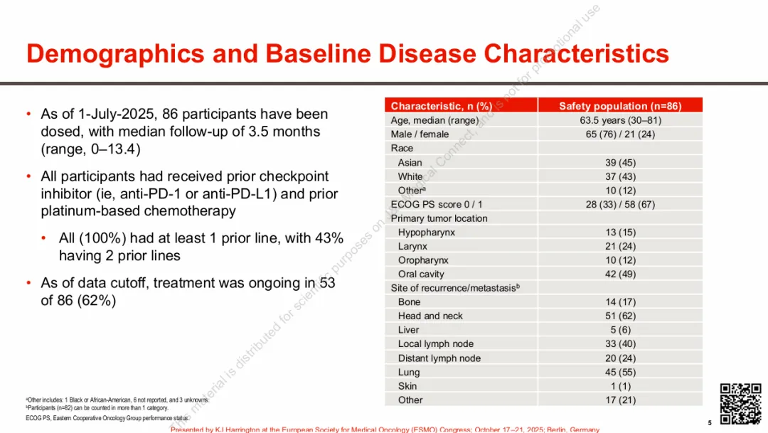 根据此前ESMO会议期间的信息,OrigAMI-5主要探索的人群为HPV无关此前未经治疗的复发转移性头颈部鳞状细胞癌患者。