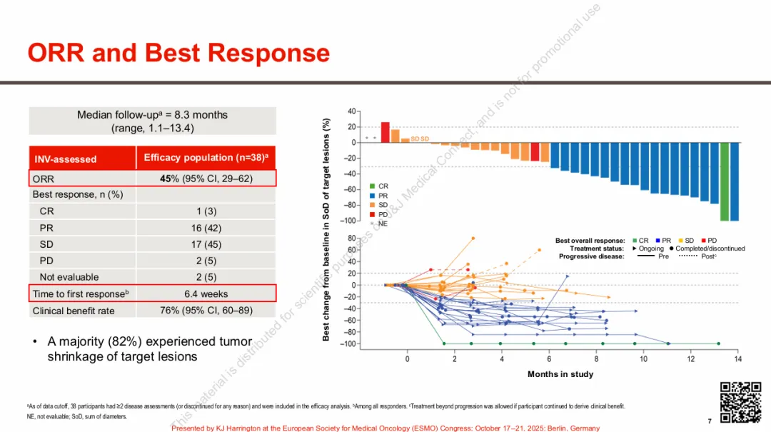 有效性方面,在已完成至少两次肿瘤评估的近40例患者中,Amivantamab单药治疗的客观缓解率(ORR)达到45%。
