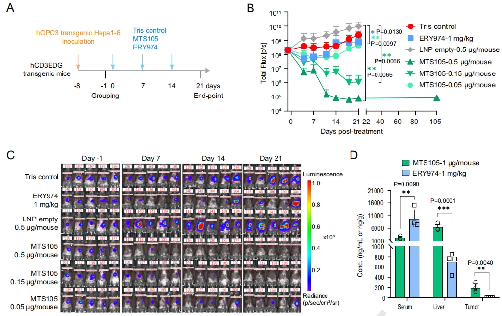 基于此,剂泰团队成功构建了mRNA-LNP药物MTS105。通过对其mRNA序列的优化,MTS105能在体内表达靶向GPC3×CD3的双特异性TCE。尤为关键的是,MTS105首次验证了无Fc区设计的双特异性抗体在T细胞激活中的独特优势,该设计能够避免反复刺激导致的T细胞凋亡与耗竭,从分子层面为其可靠的安全性及持久的疗效奠定了基础。