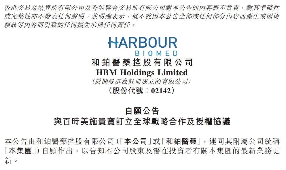 图1. 和铂医药与BMS达成合作协议,来源:和铂医药官方公告