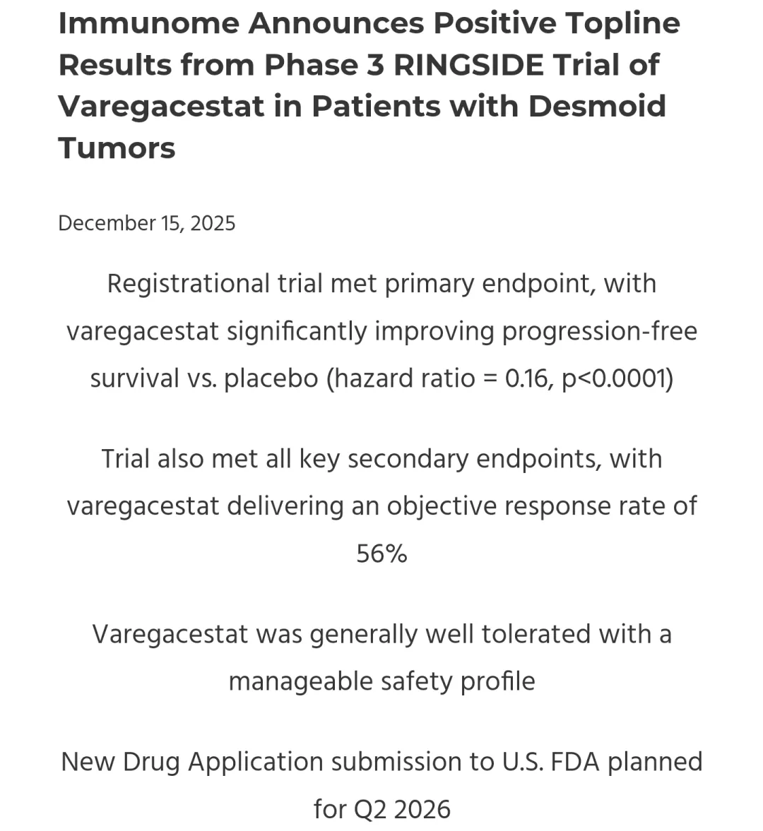 2025 年 12 月 16 日,上海——美国 Bothell 总部的新兴肿瘤精准疗法公司 Immunome Inc.(NASDAQ: IMNM)宣布,其关键 III 期 RINGSIDE 试验(NCT04871282)获得压倒性阳性结果:口服、每日一次的 γ-分泌酶抑制剂(GSI)varegacestat 在治疗进展性硬纤维瘤(desmoid tumors)患者中,较安慰剂显著延长无进展生存期(PFS),风险比(HR)0.16,p<0.0001,相当于疾病进展或死亡风险降低 84%。