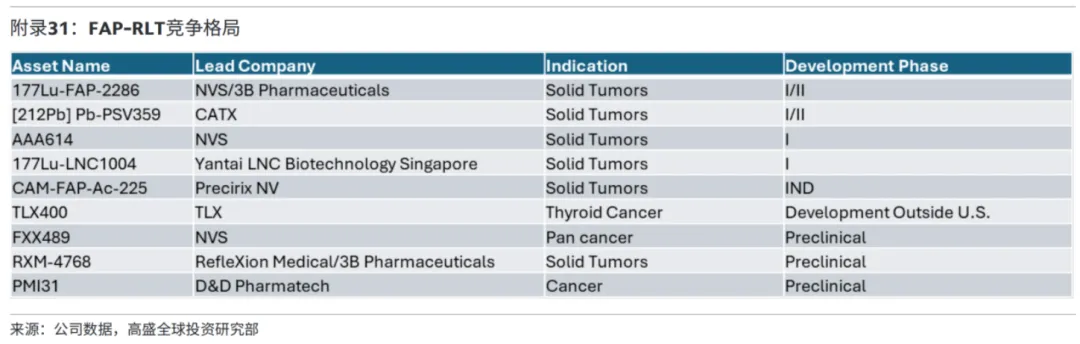 据高盛数据,FAP放射性配体疗法全球竞争格局良好,海外进入临床阶段的资产普遍处于临床早期和临床前阶段,其中布局深度最高的莫过于核药巨头诺华,FAP是继SSTR和PSMA之后重注的RDC开发方向,这反映出其背后巨大的潜力。