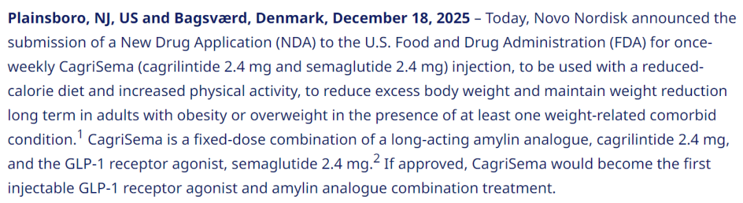 2025年12月18日,诺和诺德宣布向FDA递交CagriSema的上市申请,这也是全球首款GLP-1+Amylin联合疗法。