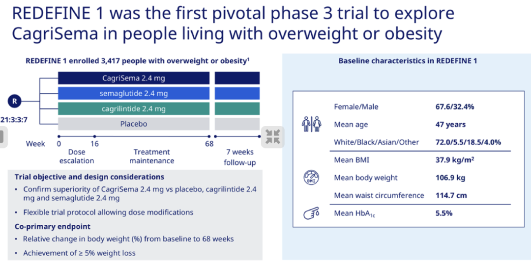 此次上市申请是依据REDEFINE 1三期临床试验的数据,该三期临床方案如下,入组3417例受试者,治疗68周。