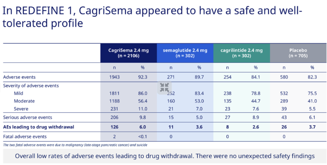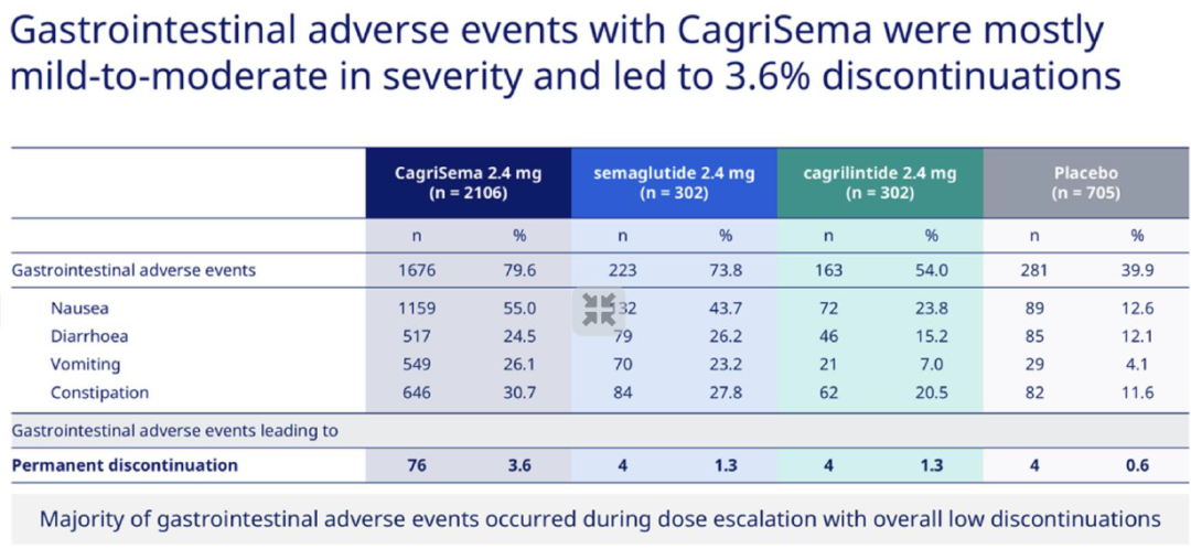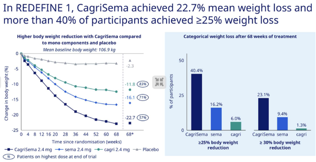 CagriSema治疗68周减重22.7%,司美格鲁肽和Cagrilintide单药治疗组分别减重16.1%、11.8%,联合治疗表现出显著的协同效应。