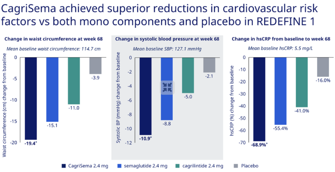 联合治疗组心血管风险因素显著改善,包括腰围、血压、CRP等。