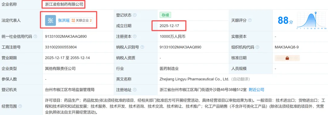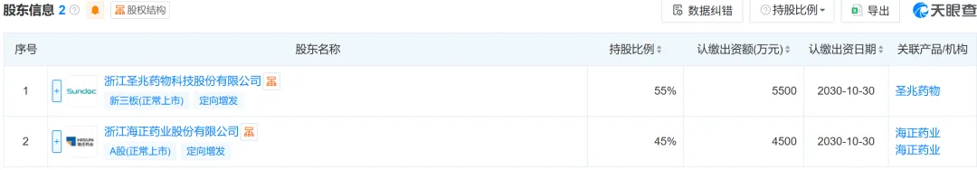 据查询,目前该合资公司已于近日成立,企业名为“浙江凌愈制药有限公司”,注册资本1亿,总投资预计23亿,其中圣兆持股55%、海正持股45%。