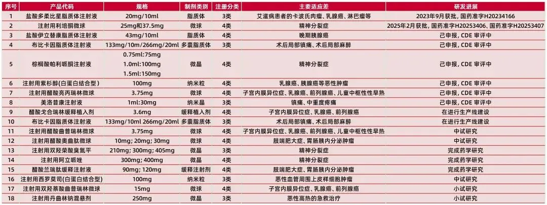 目前已知信息,这11个计划要做的复杂注射剂包含利培酮微球、帕利哌酮等精神分裂症治疗领域产品,以及亮丙瑞林、曲普瑞林、奥曲肽、兰瑞肽等激素调节领域产品,同时还包含镇痛、抗癌等治疗领域的相关管线。