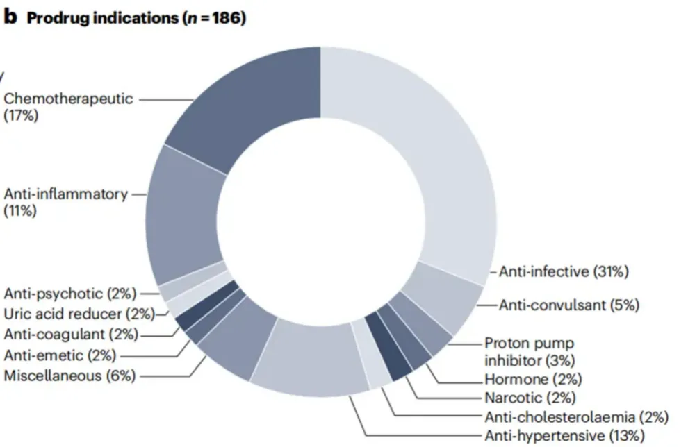 根据《Nature drug discovery》的统计,FDA共批准了178款前药,占所有获批小分子药物的9%。其中最大适应症分类为抗感染药(33%,58种),其次是化疗药(18%,32 种)、抗高血压药(14%,25 种)和抗炎药(12%,21 种)。