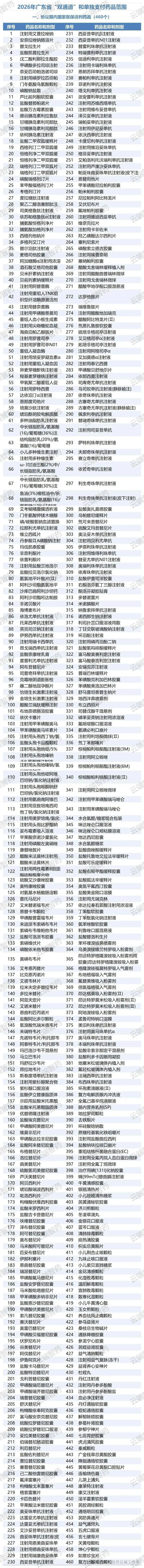 12月24日,广东省医保局发出《关于印发2026年“双通道”和单独支付药品范围相关工作的通知》,其中,协议期内国家医保谈判药品(460个)、竞价药品(12个)、转为医保药品目录内常规药品的原国谈药(242个)、医保药品目录内“岭南名方”医疗机构制剂(15个)。此外,过渡期至2026年6月底按原支付标准支付的原国谈药(8个)