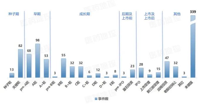 从融资轮次分布分析,一方面,早期融资(A轮及以前)事件最为活跃,表明资本仍在积极布局前沿创新源头。另一方面,直接面向上市通道的后期融资(如IPO、定增)与寻求产业协同的战略投资也保持了一定热度。相比之下,需要持续“烧钱”推进临床的中后期阶段(B轮到E轮)融资事件明显减少,反映出资本在该阶段的选择日趋谨慎,更聚焦于技术壁垒高、商业化路径清晰的项目。整体而言,市场投资逻辑正从广撒网转向精筛选,价值判断更为理性。