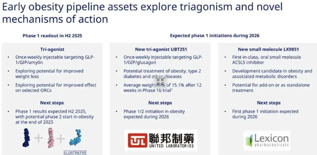可以预见的是,这款产品将成为诺和诺德进展最快的高潜竞品,为进一步增长带来极大信心。目前,诺和诺德计划于2026年Q1启动皮下注射和口服Amycretin针对超重或肥胖成年人的Ⅲ期试验。此外,后续其还将推动GLP-1/GIP/GGG(联邦制药引进)、两款GLP-1/GIP/Amylin三靶点激动剂的临床开发,以进一步增强管线矩阵。