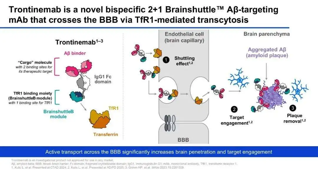 2022年底,罗氏的Aβ抗体gantenerumab在两项Ⅲ期临床试验中均告失败,项目被迫终止。然而,通过采用其创新的脑穿梭药物递送技术“Brainshuttle”,罗氏以2+1的设计方式推出trontinemab,将gantenerumab与靶向转铁蛋白受体1(TfR1)的蛋白域融合在一起,利用脑血管内皮细胞上高表达的TfR1,通过受体介导的转胞吞(transcytosis)跨越血脑屏障,将更多的gantenerumab成功递送到中枢神经系统中,并在中枢通过抗体依赖的胞吞作用(ADCP)清除聚集的Aβ斑块。这种Brainshuttle技术使得trontinemab在低剂量下就能在中枢神经系统中实现高暴露量,从而更有效地清除大脑中的Aβ斑块,同时降低了因高剂量给药而带来的副作用风险。