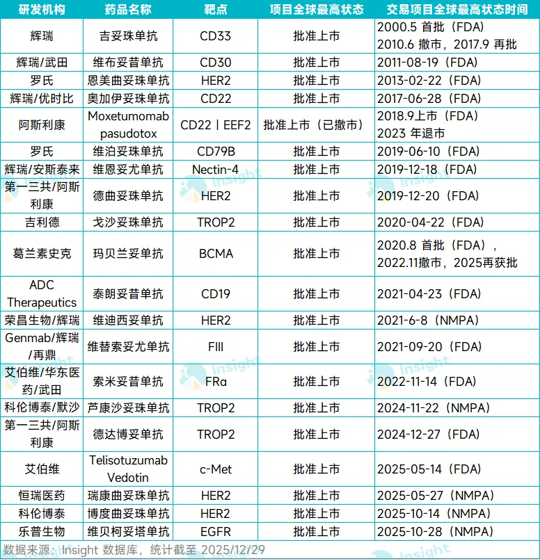 ADC 的发展历程是一部从技术探索到市场爆发的创新史诗。根据 Insight 数据库,自 2000 年首款 ADC 药物 Mylotarg 获批至今的二十六年中,全球仅有 20 款 ADC 新药获批上市。