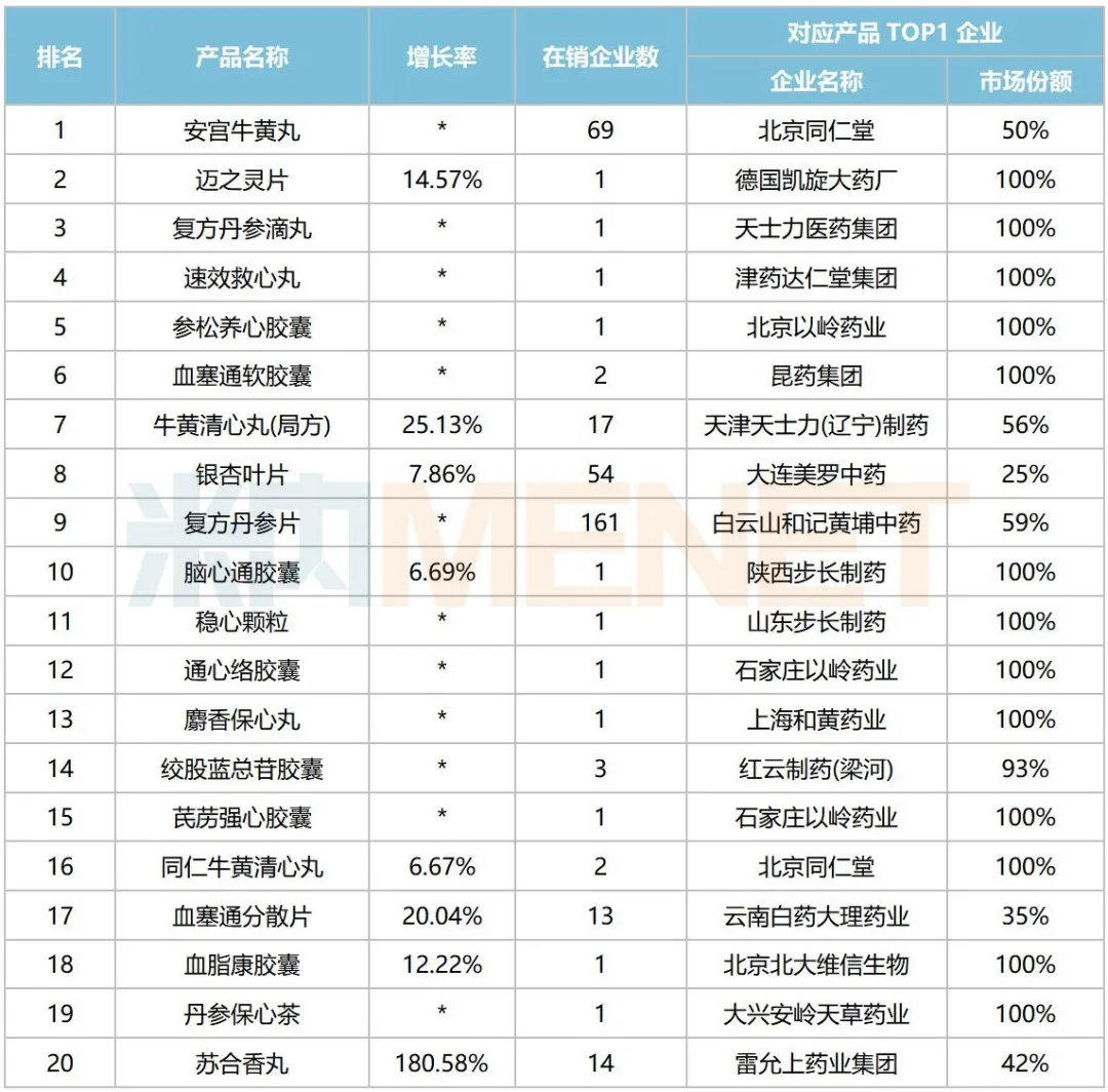13个独家品种霸榜,以岭药业(参松养心胶囊、通心络胶囊、芪苈强心胶囊)以3个品种领跑,步长制药(脑心通胶囊、稳心颗粒)、华润医药(复方丹参滴丸、血塞通软胶囊)以2个品种紧接其后,津药达仁堂的速效救心丸、上海和黄药业的麝香保心丸、北京同仁堂的同仁牛黄清心丸等亦上榜。