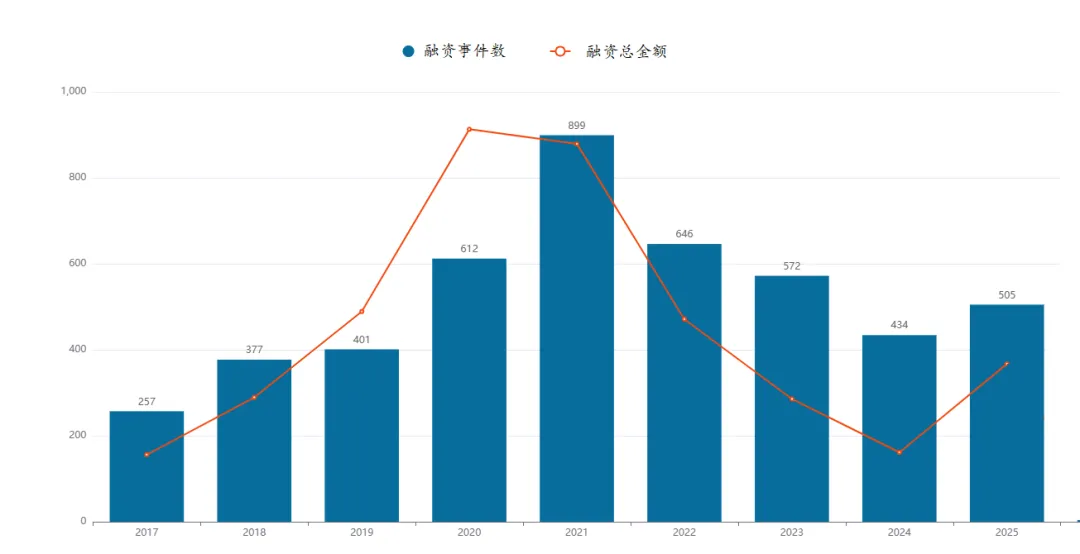 医药魔方MedAlpha新药投融资数据库显示,2025年,中国创新药总体融资达到146.84亿美元,总计发生融资505起。从融资总额来看,这一数字已接近2019年的水平;从融资事件数看,505起融资则已超过2018年和2019年,逼近2020年的水平。