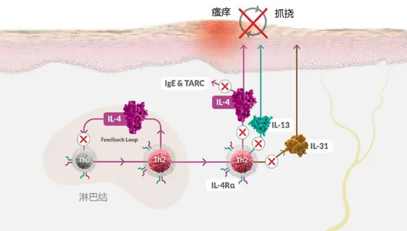 图:以特应性皮炎为例,度普利尤单抗靶向IL-4Rα的作用机制