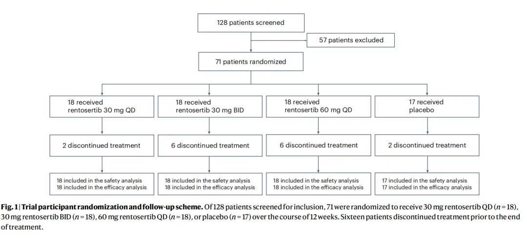 基于Rentosertib的IIa期设计来看,试验分成四组,患者分别服用30mg每日一次、30mg每日两次、60mg每日一次以及接受安慰剂治疗,接受Rentosertib治疗三组患者人数为18人,接受安慰剂治疗组为17人。