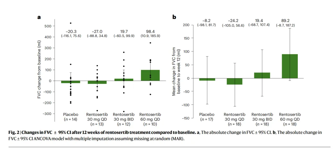 更加值得注意的是疗效数据,高剂量的Rentosertib能够使得IPF肺部功能有明确改善,这里我们采用《自然·医学》中更详细的图表和数据。
